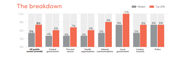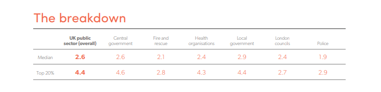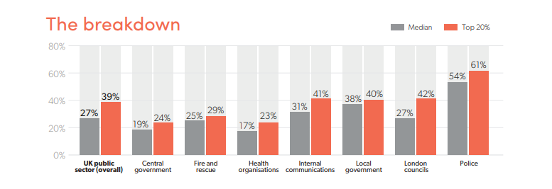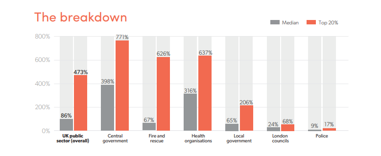 Average performance metrics for central government, local authorities, London borough councils, the police, fire and rescue services and health organisations